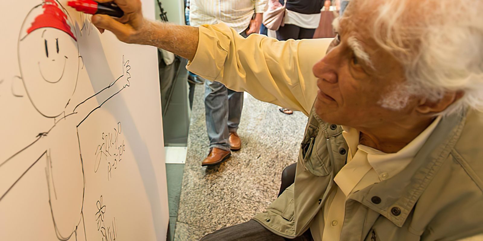 Na verdade, a curadora explicou que se trata de um grande salão que vai criando ambientes. Em um desses ambientes, a imagem do visitante é capturada e projetada dentro de uma ilustração de Ziraldo na parede em frente a ele. “O visitante vira então um personagem do desenho, daquela cena. Tem um menu de desenhos e o visitante pode escolher em qual imagem ele quer aparecer”. Na parte de percepção pelo desenho, há outro ambiente com mesas digitais, que o público escolhe qual desenho quer colorir, por textura diferente . Em seguida, o desenho é projetado muito grande na parede e os outros visitantes passam a ver sua arte, como você se tornou coautor de Ziraldo naquela ilustração.