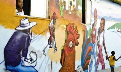 Em um muro da favela do Cantagalo, no Rio de Janeiro, o grafite mostra uma mulher carregando uma lata na cabeça. Lembrança dos tempos em que...