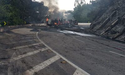Um incêndio em um caminhão carregado de combustível, que tombou na altura do quilômetro 96 da BR-040, em Duque de Caxias, na pista em direção a...