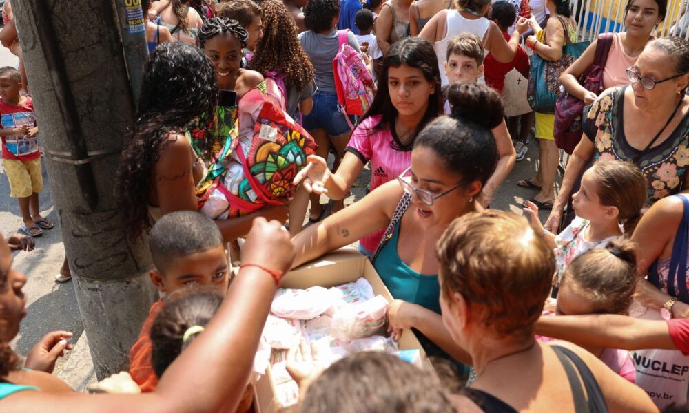 “Pegamos dois!”, grita uma criança com cerca de seus 10 anos de idade, enquanto corre com um saquinho de doce em cada uma das mãos, em...
