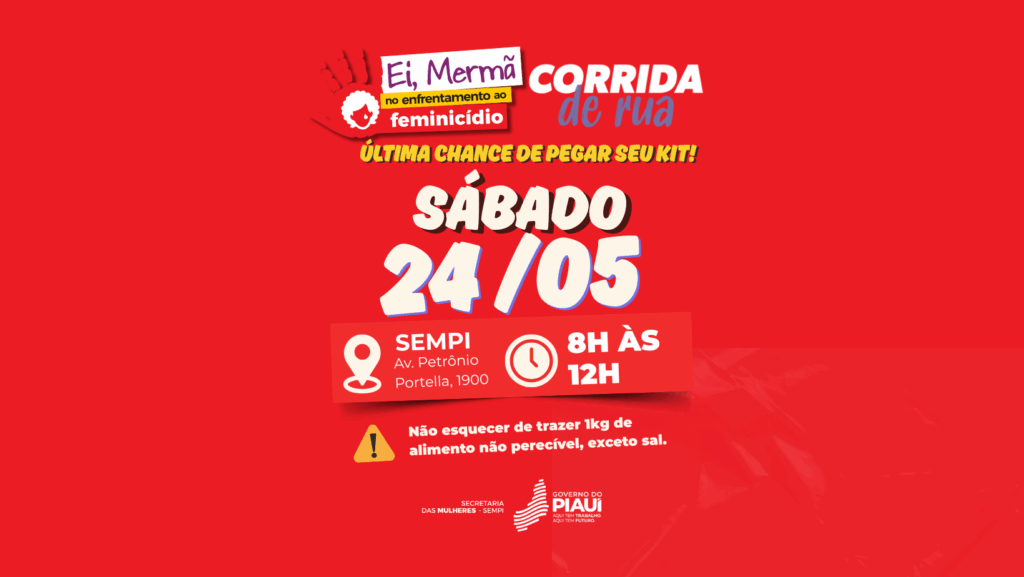 A Secretaria das Mulheres (Sempi) prorrogou a entrega dos kits para a Corrida contra o Feminicídio até este sábado (24), das 8h às 12h, na sede da Secretaria, localizada na Av. Petrônio Portela, nº 1900, na zona norte de Teresina.
