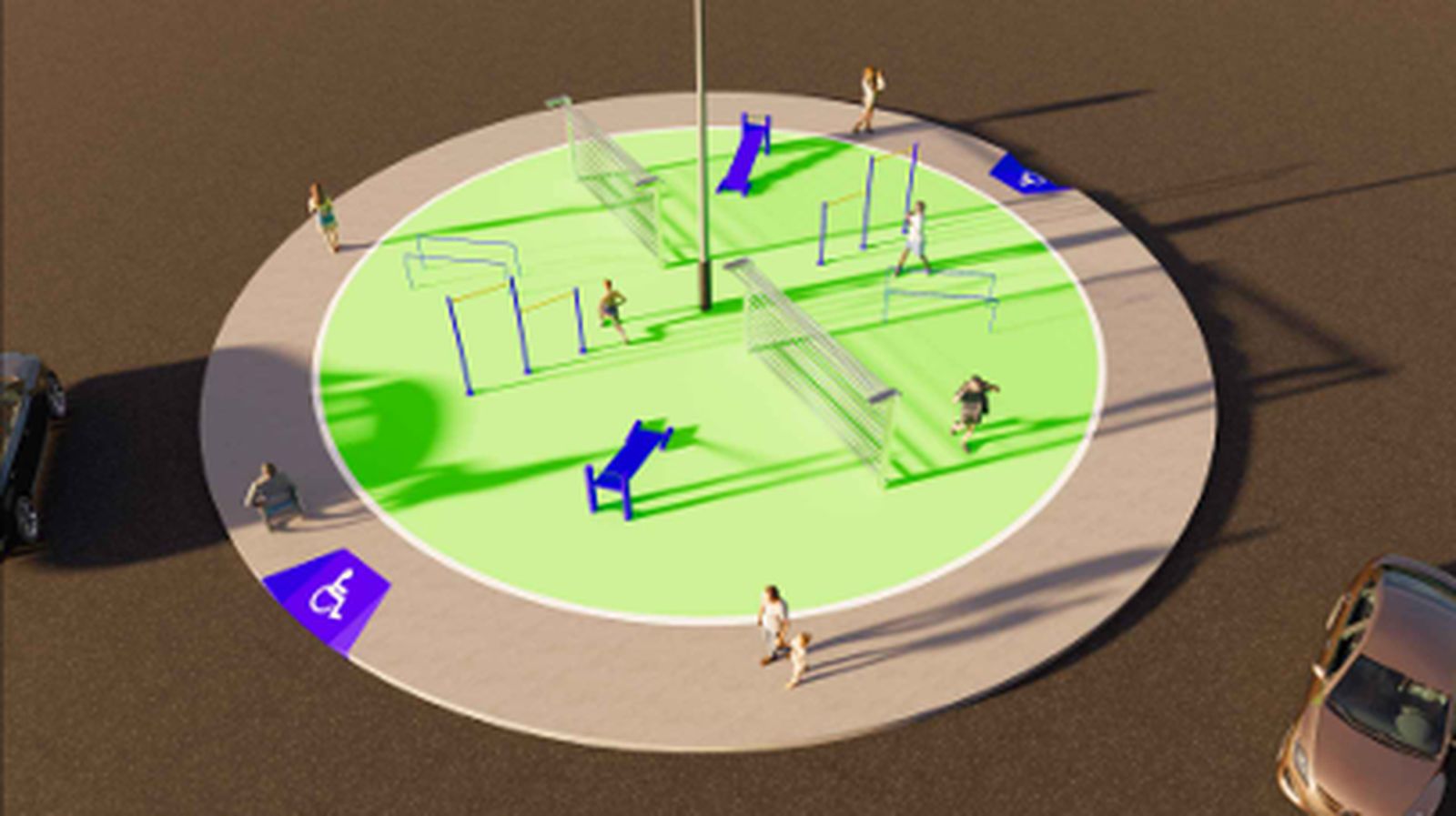 Nesta terceira etapa, será construída uma guarita de apoio, com estrutura em concreto e madeira tratada. Também será implantada uma rotatória com academia ao ar livre, equipada com barras paralelas, prancha abdominal e aparelhos para alongamento.