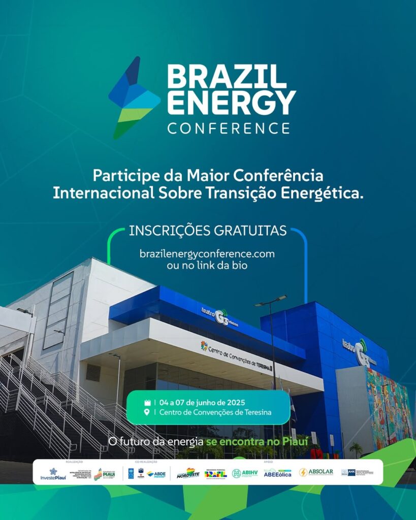 De 4 a 7 de junho, o Brasil sediará a Brazil Energy Conference 2025. A programação gratuita inclui painéis, laboratórios, oficinas e exposições, com foco em soluções concretas para os desafios da transição energética global. O evento será realizado no Centro de Convenções de Teresina, capital do Piauí, em formato híbrido (presencial e online), com acesso gratuito ao público. Com mais de 7000 participantes esperados, entre presenciais e virtuais, o evento reunirá especialistas de renome, representantes de governos, setor produtivo, universidades, sociedade civil e organismos internacionais.
