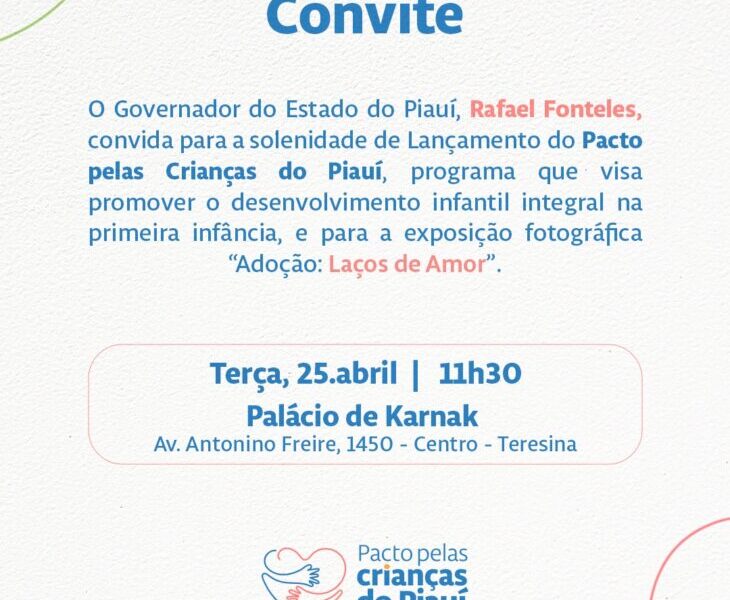 O governador Rafael Fonteles e a primeira-dama do Estado, Isabel Fonteles, lançam, nesta terça-feira (25), o programa “Pacto pelas Crianças”. A solenidade de lançamento será realizada,...